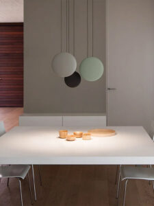 Vibia Knit è una sospensione che sembra un grande maglione di luce: il volume rivestito in tessuto lavorato diffonde una luce calda e avvolgente a 360°, con una sensazione di comfort immediato, perfetta per tavoli dove la convivialità viene prima di tutto. Vibia Kosmos (Kosmos/Cosmos) lavora invece per geometrie sospese: dischi sottili che sembrano piccoli pianeti, sorretti da cavi quasi invisibili, ideali quando vuoi che il tavolo diventi il centro di una costellazione leggera e scenografica, contemporanea ma discreta.